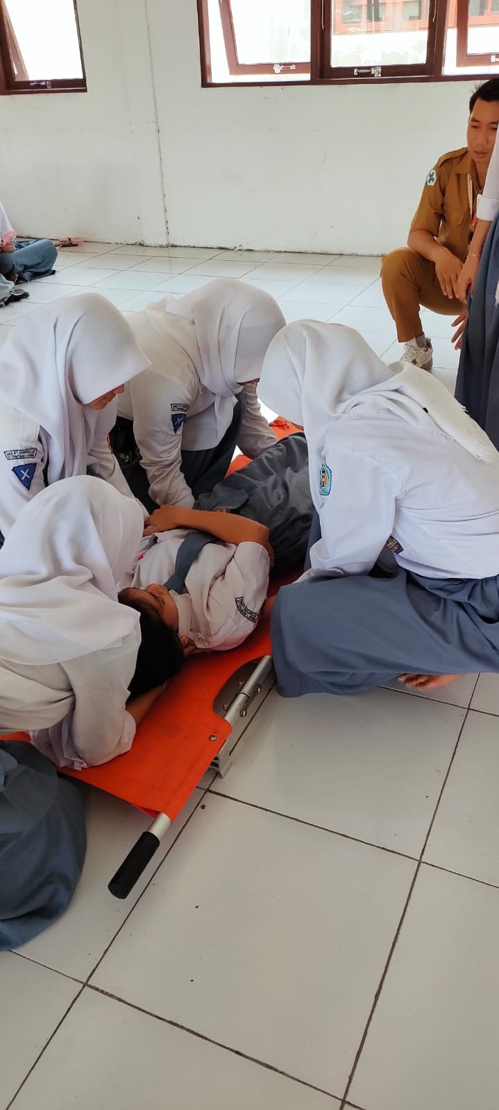 Tidak hanya mendengarkan teori, para siswa juga berkesempatan melihat simulasi tindakan penyelamatan yang harus dilakukan ketika menemukan orang yang tidak sadarkan diri di lingkungan sekitar.